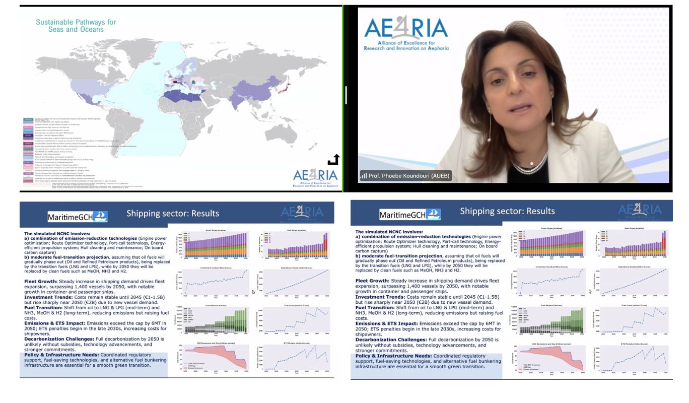 Prof. Dr. Phoebe Koundouri, Principal Investigator of the project at Athena Research Center, shared invaluable insights on the policy framework for the transition to sustainability. She emphasized cutting-edge scientific approaches for achieving climate neutrality and resilience in shipping and port operations, while also highlighting initiatives, projects, and case studies on sustainable blue economy strategies, digitalization, and green technologies—pioneered by AE4RIA.