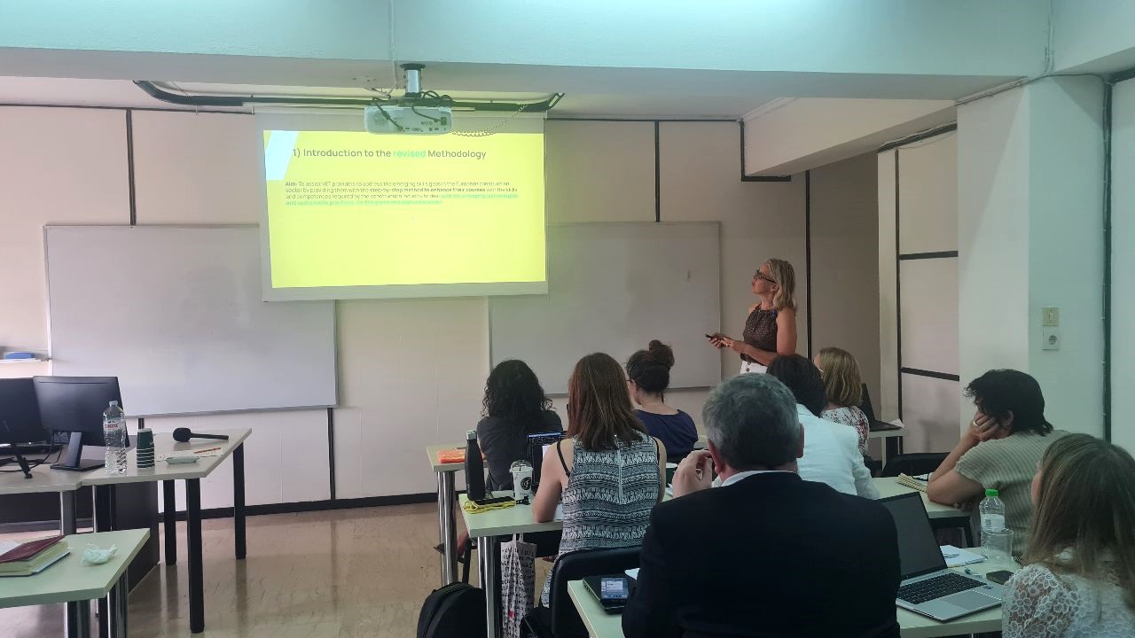 Research Laboratory AUEB team, Resees, represented by Dr. Ebun Akinsete and Voula Samara, presented our methodology for upskilling and reskilling VET providers in the construction sector with green and digital skills. Eleni Toli and Panagiota Koltsida introduced the digital platform designed to support this methodology. AUEB oversees WP2 and T2.3, set to be delivered in September, focusing on developing methods for VET providers in the construction sector.