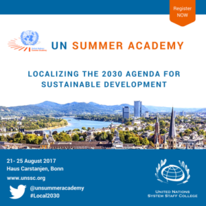 The UNSSC Knowledge Centre for Sustainable Development is pleased to invite you to the UN Summer Academy 2017 titled Localizing the 2030 Agenda for Sustainable Development happening from 21 to