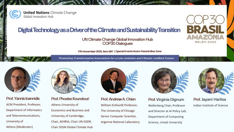 As COP30 unfolds in Belém, Prof. Phoebe Koundouri will participate in a high-level session, part of the UNFCCC Global Innovation Hub (UGIH) COP30 Dialogues, highlighting how artificial intelligence and digital public goods can accelerate fair, inclusive, and accountable progress toward the Sustainable Development Goals. Supported by the Association for Computing Machinery (ACM) and the SDSN Global Climate Hub, this discussion convenes global leaders shaping the future of responsible AI for climate action and sustainable development.