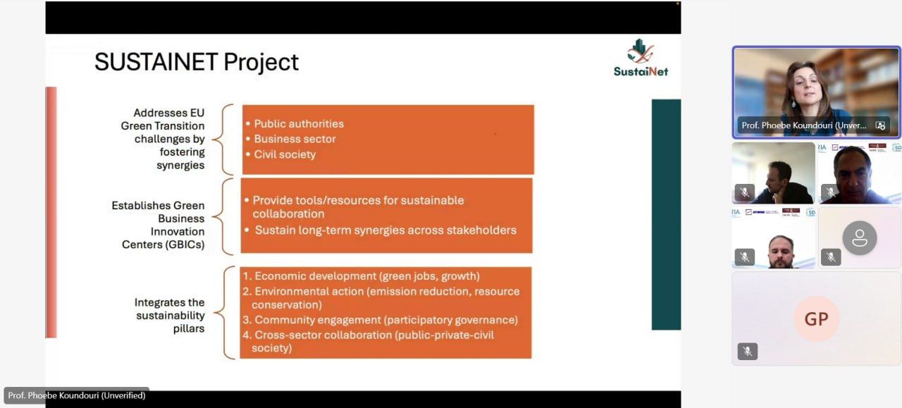 Led by the Athens University of Economics and Business, RESEES Research Laboratory AUEB, and AE4RIA – Alliance of Excellence for Research and Innovation on Αephoria, under the scientific guidance of Prof. Dr. Phoebe Koundouri, SustaiNet Erasmus+ is co-funded by the European Union’s Erasmus+ programme and brings together key partners from Greece, Cyprus, and Bulgaria. Prof. Koundouri delivered the opening speech, outlining the project’s objectives and collaborative vision.
