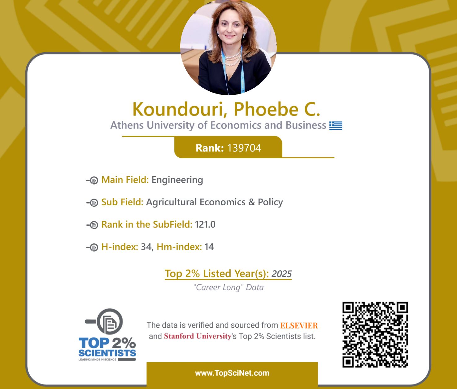 Prof. Phoebe Koundouri has been included once again in the Stanford University & Elsevier Top 2% Scientists list (2025 edition), which recognizes the world’s leading researchers across all scientific fields.