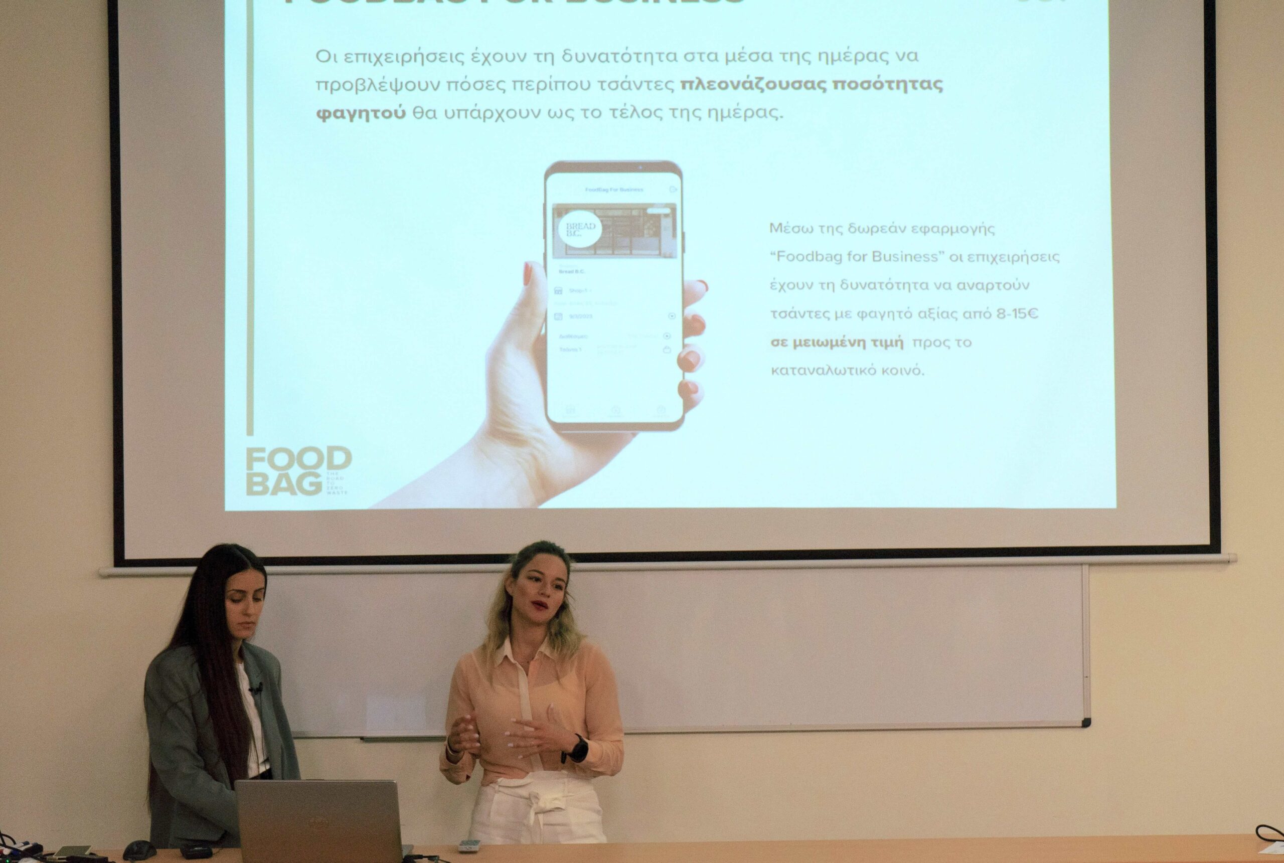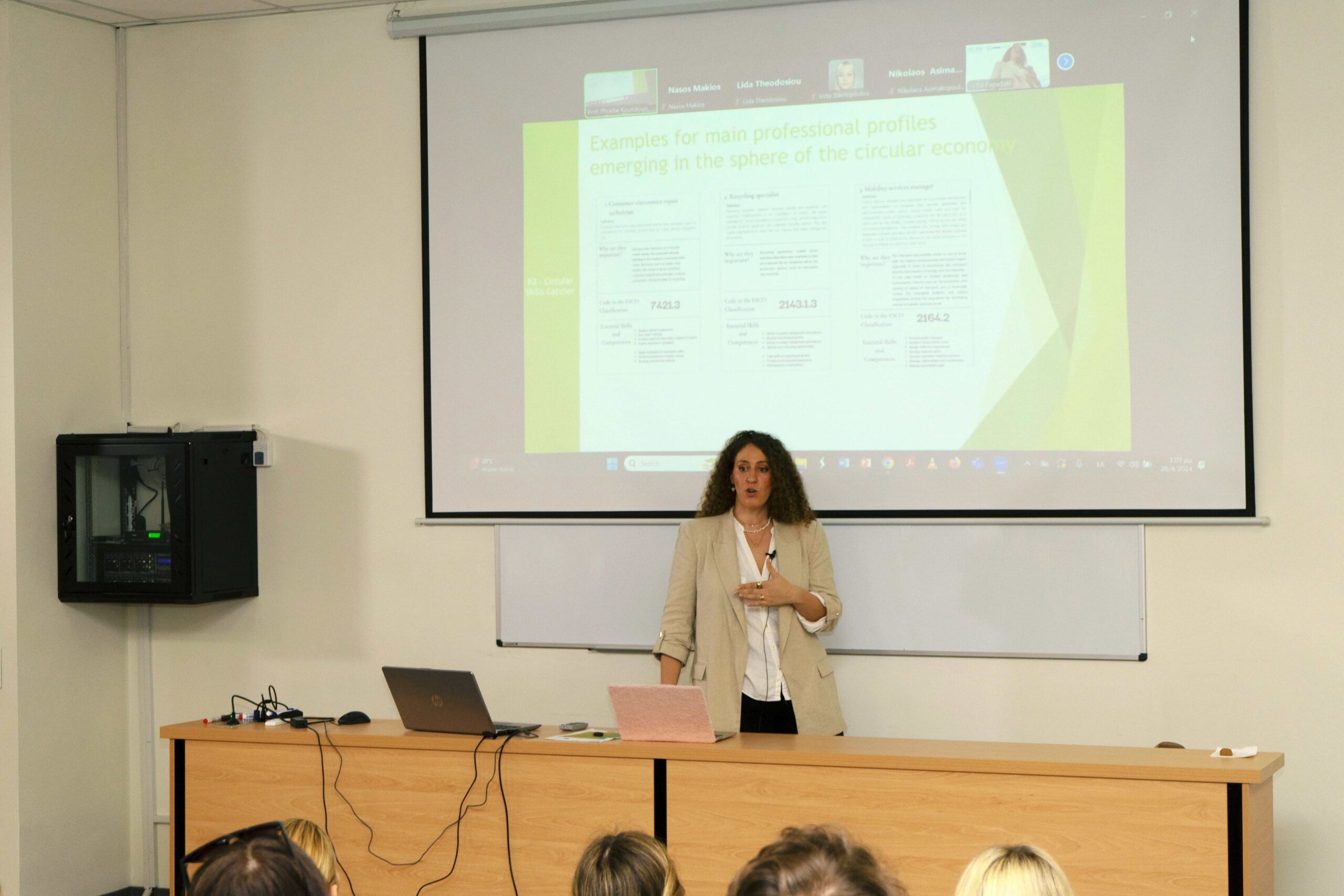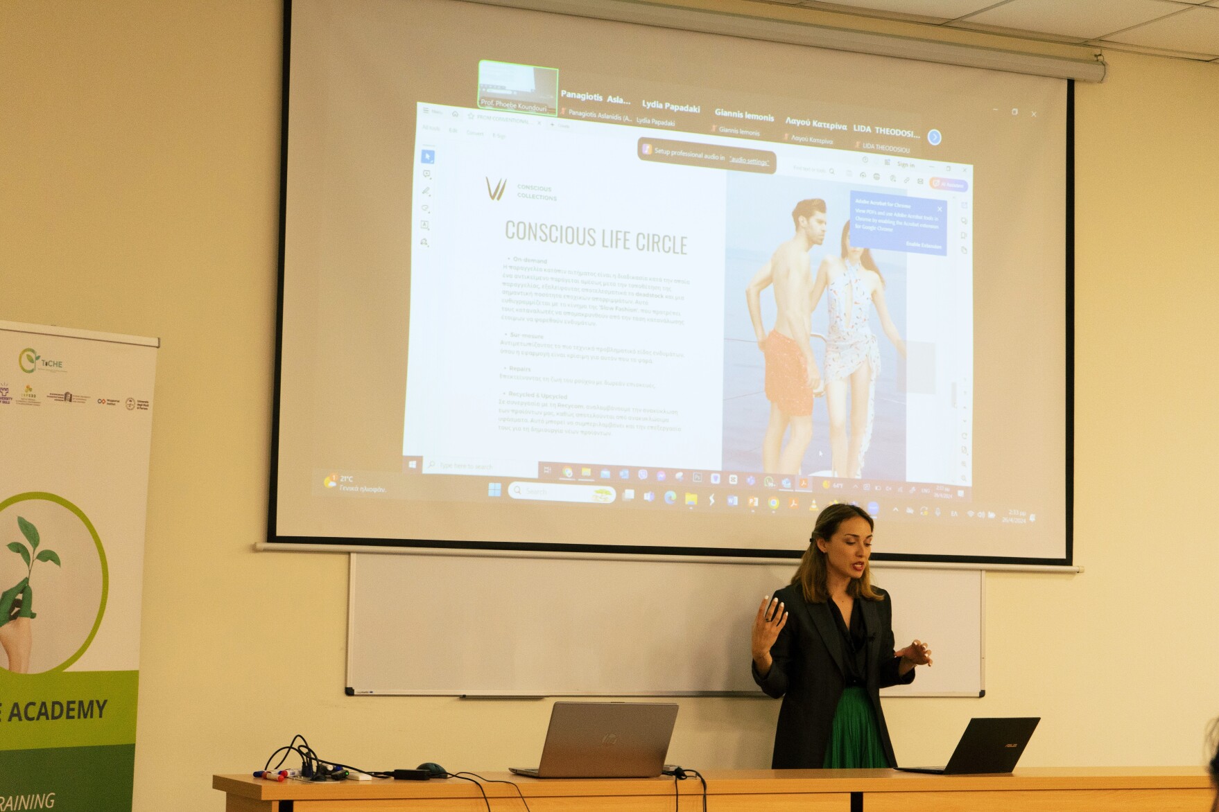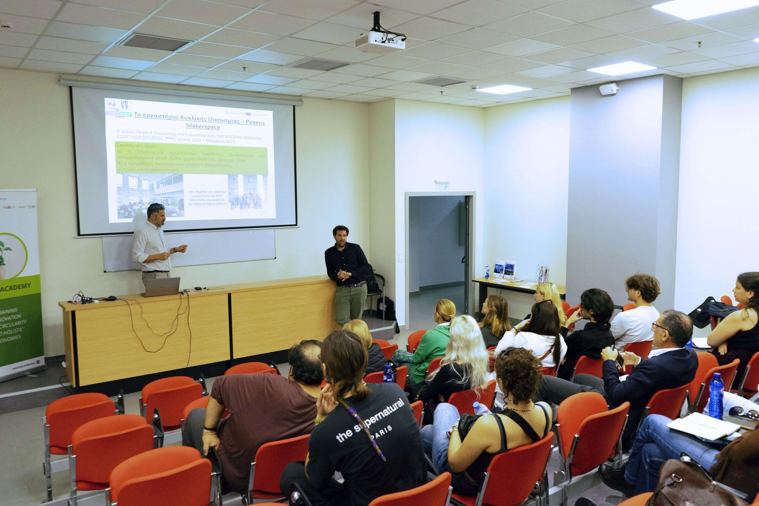 Then, four businesses from the food, construction, textile and fashion industries presented their work, aiming to showcase the applicability of the circular economy framework. Using their innovative business models, Mr. Nasos Makios, European Climate Pact Ambassador and Environmental Manager in the family business “KLIMIS”, presented how KLIMIS is implementing successful circular bioeconomy for more than 30 years; Ms.Laura Kyriazopoulou, co-founder at FoodBag and Ms. Antigoni Chariessa Vasilopoulou, Sales & Sustainability Specialist at FoodBag, presented how food waste can be eliminated; Mr. Jimmy Nicolaides, Co-Founder Swap planet, showcased how Swap planet is empowering parents to embrace sustainable practices by offering a clothing, book, and toy exchange platform that saves them money while reducing waste; Ms. Valentina Vasilatou, Owner & Designer at VV Conscious Collections, who through her designs, she advocates for fashion as a force for innovation, conservation, and awareness. Additionally, she creates abstract patterns of sea creatures, introducing new animal prints into the fashion world. Mr. Konstantinos Liatzas, Environmental Engineer, MSc “Environment & Development,” and Mr. Jason Giraud, PhDc at CastorC, presented the initiative Piraeus Maker Space, which provides state-of-the art tools available to citizens and innovators.