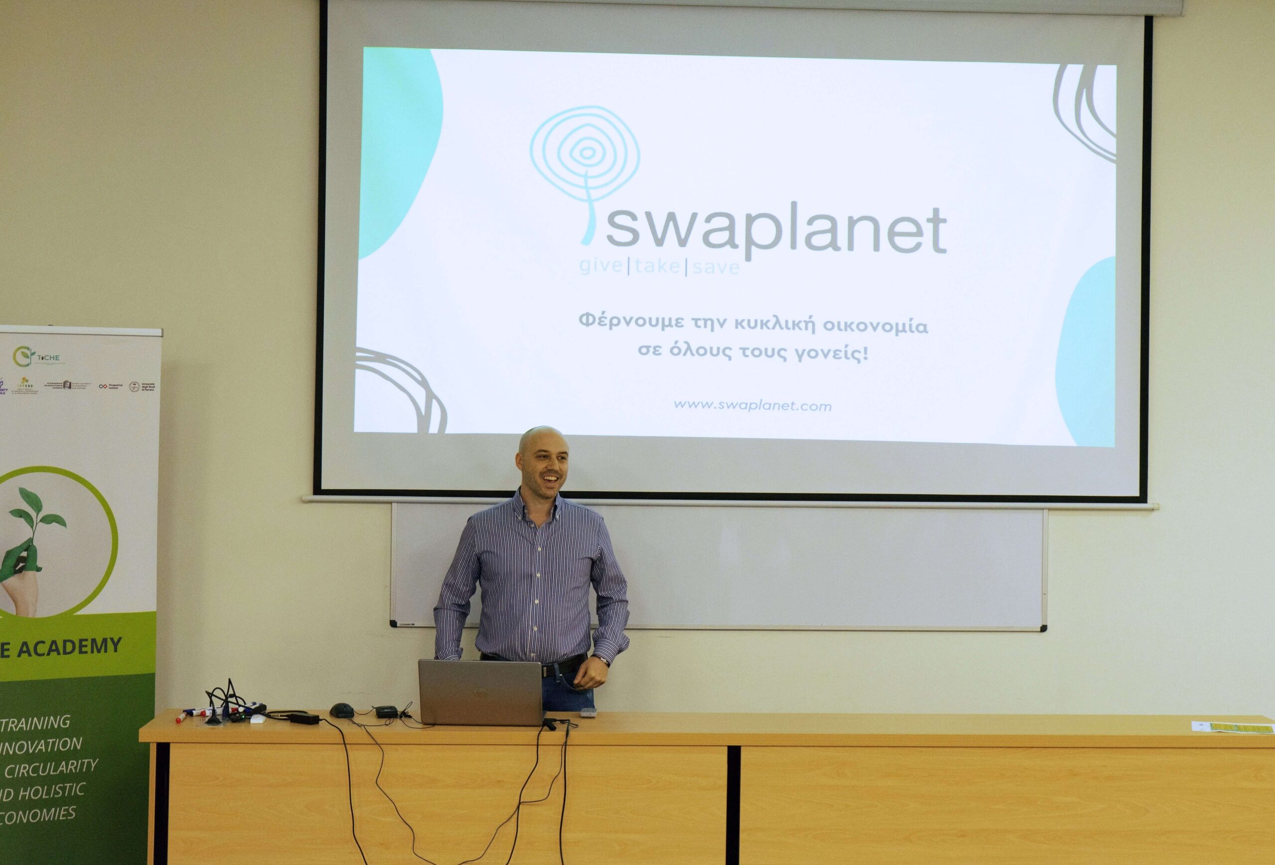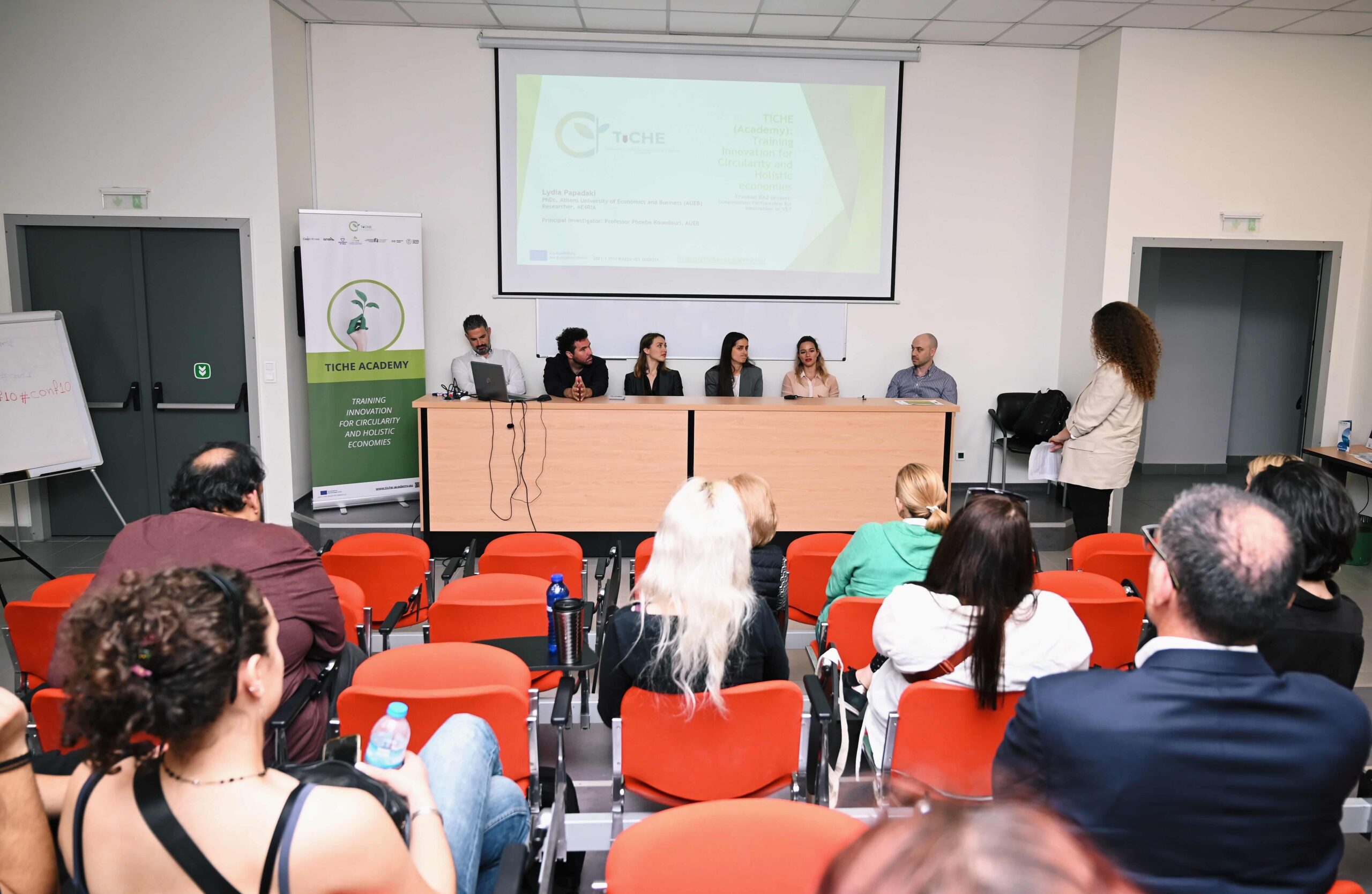 On Friday, April 26, 2024, between 12 and 15 p.m. EEST, a Greece Multiplier Event with the title “Transition to Circular Societies: The Role of Education” was organized by Athens University of Economics and Business (AUEB) and held at the Troias Amphitheatre, AUEB, in Athens, Greece. The event was organized under the Erasmus+ TICHE Academy and aimed at raising awareness regarding the shift towards circular societies, which signifies a pivotal shift in our pursuit of sustainable development as it entails the efficient utilization of resources, the reduction of waste, and the mitigation of environmental impact.