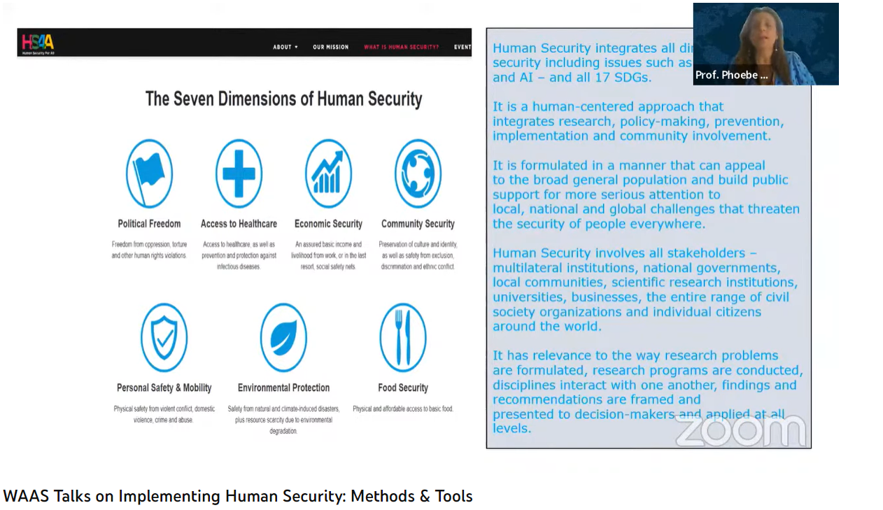Human Security, as defined by the UN, integrates all dimensions of security – economic, food, health, environmental, community, personal, and political, including issues such as cybersecurity and AI – and all 17 SDGs. It is a human-centered approach that integrates research, policy-making, prevention, implementation and community involvement. In addition, it is formulated in a manner that can appeal to the broad general population and build public support for more serious attention to local, national and global challenges that threaten the security of people everywhere. All of humanity has a stake in Human Security.